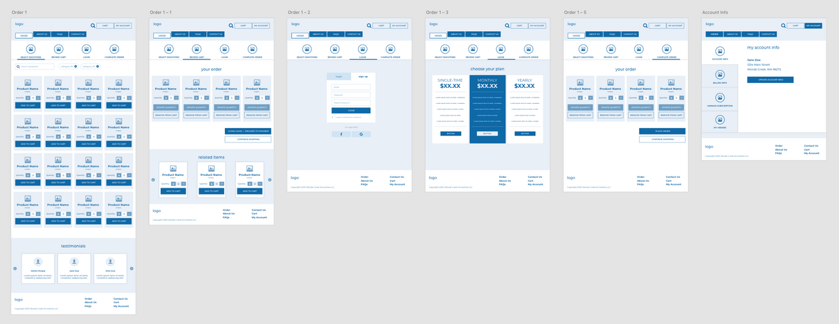 Our final project was to create a website where people from a specific area could order custom food for delivery to their house. We had to take into account how someone would navigate the site, add and remove parts of their order, and think through the entire order process. I chose to create an organic smoothie delivery service for the rural area of Woods Creek, WA where I live. There is no food delivery available out here, so having smoothies and healthy items available for delivery that are pre-frozen and ready when I am, seemed like a great idea.
